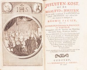 [Religion]. Jesuiten-kost, of de Maaltyd der Jesuiten, op de welke verscheide vaaderen der voorsz societeit ; niet alleen hebben koomen te noodigen de roomse pausen ; maar ook keiseren, koningen, princen en vorsten. 1726, aux depens de la Compagnie....