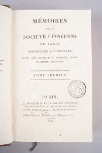 [Sciences]. Mémoires de la société linnéenne de Paris, précédés de son histoire, depuis 1788, époque de sa fondation, jusque et compris l’année 1822. Tome premier. Paris, secrétariat de la société linnéenne, Audot et Bebeausseaux,...