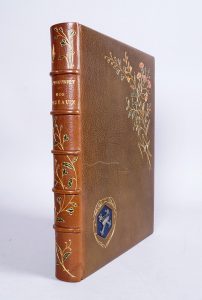 avec un X couronné en métal sur le premier plat, encadrement intérieur en maroquin vert et marron orné, gardes de soie verte, tranches dorées sur témoins, couvertures et dos illustrés conservés, étui (reliure de l’époque de Marius Michel). Première édition, illustré de 110 compositions en couleurs par Hector Giacomelli dont 20 planches, 21 encadrement de poèmes, en-tête, lettres ornées et culs-de-lampes. Un des 25 exemplaires sur papier des manufactures impériales du Japon avec une aquarelle originale signée de H. Giacomelli sur le faux titre. Bel exemplaire avec une suite en bistre de toutes les illustrations (sauf celles de la couverture). Ex-libris Maurice Quarré. Dos passé.
