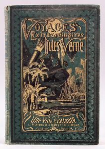 Jules VERNE. Une ville flottante et Aventures de 3 Russes et de 3 Anglais. Paris, Bibliothèque d’éducation et de récréation J. Hetzel et Cie. Cartonnage d’éditeur à l’obus sur fond vert (plats frottés, dos usé).