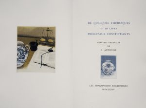 ANTONINI (A.). De quelques thériaques et de leurs principaux composants. Gravures originales de A. Antonini. [Paris], Les Pharmaciens bibliophiles, 1985. In-4 en feuilles, sous couverture et emboîtage toilé bleu de l'éditeur (qq. rousseurs sur 2...