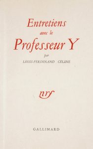 CELINE (Louis-Ferdinand). Entretiens avec le professeur Y. Paris, Gallimard, 1955. In-12, broché (en partie non coupé). Édition originale : un des 85 exemplaires sur vélin pur fil Lafuma-Navarre (second papier après 36 vergé de Hollande).