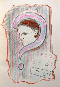 COCTEAU (Jean). Théâtre. Paris, Grasset, 1957. 2 forts vol. in-8, reliure plein maroquin rouge, dos lisse, titre, tomaison et date dorés, plats ornés de 2 figures mosaïquées dont un visage de profil, couvertures et dos conservés, étuis...