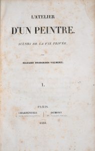 DESBORDES VALMORE (Marceline). L'Atelier d'un peintre. Scènes de la vie privée. Paris, Charpentier, Dumont, 1833. 2 tomes en un volume in-8, VIII-370 p., [2] f., reliure de l'époque demi-veau rouge cerise, dos lisse, auteur, titre et tomaison...