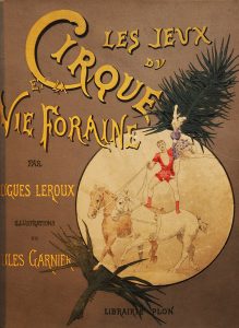 * GARNIER. LE ROUX (Hugues). Les jeux du cirque et la vie foraine. Illustrations de Jules Garnier. Paris, Plon, 1889. In-4, [2] f., V-250 p., reliure demi-chagrin gris clair à coins, dos à 4 nerfs, auteur, titre, illustrateur dorés, tête dorée,...