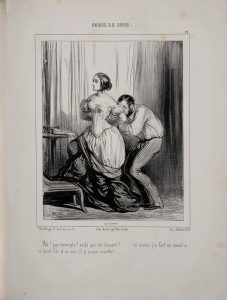 - Paris le matin, Paris le soir. S.l., s.d. [Paris, Charivari, vers 1840]. In-4, reliure époque demi-basane havane, dos lisse et orné, 2 suites de lithographies d'après Gavarni : Paris le matin (12 planches) et Paris le soir (25 planches), toutes deux complètes et tirées sur vélin fort (coiffe de tête usée, déboîté, brunissures sur certaines planches).