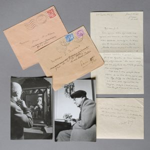 - Grand Hôtel, Grasse, 20 septembre [19]41. 2 pages ½ in-8. Avec enveloppe autographe. Il regrette de n'avoir pas passé plus de temps avec son correspondant, "du temps que les rencontres étaient faciles". Breitbach a dû, en ce temps troublés, se dissimuler : " Qu'il est lugubre de devoir souhaiter votre éloignement ! Du moins sachez que ma profonde et fidèle sympathie vous accompagne ". Il remercie pour les livres reçus (Saroyan, et Huxley). " C'est une grande tentation pour moi de de donner le meilleur de mon temps à la lecture. Pourtant je m'efforce au travail […] mais constamment vient affleurer l'angoisse de l'attente de je ne sais quels énormes évènements susceptibles de bouleverser le monde et nos destinées ".