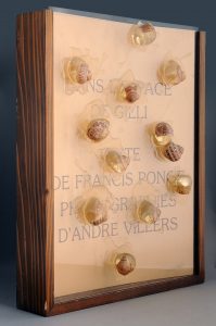 face principale est constituée d'une œuvre originale sur plexiglas de Claude Gilli, " Poésie au ras du sol ", qui met en scène 12 coquilles d'escargots fragmentaires complétées en résine (une plaque de carton formant couvercle pourrait manquer).