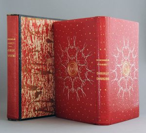 couvrant chaque plat, composé de 21 pinces chirurgicales argentées disposées en cercle, avec au centre 8 cercles concentriques dorés, tranches dorées, couvertures et dos conservés, contreplats ornés d'une large bordure de maroquin rouge à filets multiples, et d'une bande noire mosaïquée, doubles gardes de satin rouge et de papier peint rouge et or, chemise demi-maroquin rouge à rabats, étui bordé de maroquin noir [G.H. Lillaz, dorure par A. Jeanne] (frottements aux arêtes de l'étui).