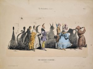 Recueil de 33 gravures, presque toutes rehaussées et gommées à l'époque. On y trouve 3 planches à partie mobile, et surtout des gravures en 2 ou 3 planches dans le style incisif propre à Grandville : Les ombres portées (2 planches), personnages costumés et costumes attribués (4 pl.), la procession du Diable, 2 planches aux personnages zoomorphes, etc. Ces suites pourraient provenir des suppléments que Philipon réservait à ses abonnés, livrés sous le titre de La Lithographie mensuelle.