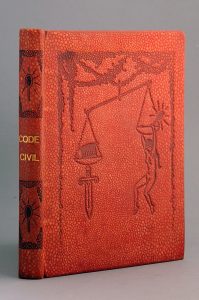 HEMARD. Code civil. Livre premier : des personnes. Illustrations en couleurs de Joseph Hémard. Paris, Kieffer, 1925. Petit in-8, reliure éditeur pleine basane rouge façon serpent, dos lisse, titre doré, ornements à froid, plat sup. orné d'une...