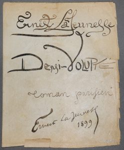 [Manuscrit]. LA JEUNESSE (Ernest). Demi-Volupté. 1899. Manuscrit autographe signé, petit in-4, [2]-97 pages, en feuilles sous chemise cartonnée, dos vélin (défauts en marge de qq. ff.). Manuscrit complet de ce " roman parisien ", publié en 1900...