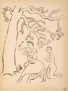 LARIONOV (Mikhaïl F.) (1881-1964). Sans titre (bord de mer, bateaux, chiens dans un paysage) et Sans titre (joueur de flute et autre personnage sous un arbre) 25 × 23 cm et 27 × 22 cm. Font partie d'une série de 32 gouaches pour le " Voyage en...