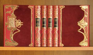 LOUŸS (Pierre). Chefs-d'œuvre. Paris, L'Ibis, 1972. 6 vol.in-4, reliure de l'éditeur, sous étuis. Belle reliure éditeur à l'imitation de l'Art nouveau : demi-basane grenat à bandes, plats de daim bordeaux, bordés de motifs floraux dorés,...