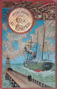 VERNE (Jules). Face au drapeau. P., Hetzel (Bibliothèque d'Education et de Récréation), [entre 1892 et 1905], grand in-8, cartonnage polychrome de l'éditeur, " Au steamer ", relié par Magnier, plaque par Souzé (dos passé, petits défauts...