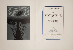 Première édition de la traduction en anglais, parue simultanément en Angleterre et aux Etats-Unis, de la nouvelle de Julien Green " Le Voyageur sur la terre ", initialement publiée chez Gallimard en 1927. Elle est illustrée de 12 bois gravés de René Ben Sussan, tirés hors-texte en couleurs. L'impression a été réalisée à Argenteuil chez Colouma, sous la direction de J.E. Pouterman.