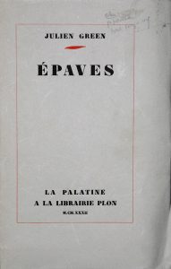 GREEN (Julien). Épaves. Paris, Plon (La Palatine), 1932. In-12, broché, chemise et étui toilés rouge, pièce de titre basane orangé (dos de la chemise passé ; témoins conservés). "Epaves est un roman volontairement intérieur, le premier...