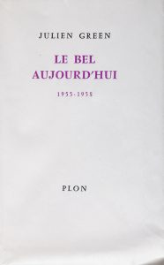GREEN (Julien). Le bel aujourd'hui. Journal (1955-1958). Paris, Plon, 1958. In-12, broché (non coupé, témoins conservés). Édition originale de ce volume formant le tome VII du Journal de Julien Green. Un des 27 exemplaires sur papier de Hollande...