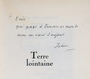 GREEN (Julien). Terre lointaine. Paris, Grasset (Les Cahiers verts), 1966. In-16, broché, couverture rempliée (non coupé). Édition originale : un des 57 exemplaires de tête (n° IV) sur vergé de Hollande. Envoi autographe signé de Julien Green...