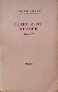 GREEN (Julien). Ce qui reste de jour. 1966-1972. Paris, Plon, 1972. In-8, broché (non coupé, témoins conservés). Édition originale de cet ouvrage formant le tome IX du Journal de Julien Green. Un des 28 exemplaires de tête sur papier...