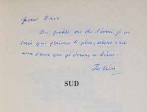 GREEN (Julien). Sud. Pièce en trois actes. Paris, Plon, 1972. In-12, broché (pli à la couv. inf.). Nouvelle édition augmentée d'une préface inédite. Envoi autographe signé de Julien Green à Eric Jourdan : " Du poète ou de l'ami, je ne sais...