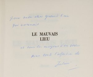 Envoi autographe signé de Julien Green à Eric Jourdan, " … qui connaît Le mauvais lieu et tous les moyens de s'en sortir ".
