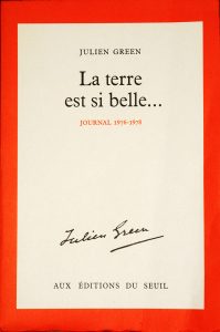 GREEN (Julien). La terre est si belle… 1976-1978. Paris, Seuil, 1982. In-8, broché (non coupé). Édition originale de ce volume formant le tome XI du Journal de Julien Green. Exemplaire numéro 2 parmi les 65 sur vergé Ingres de Lana, seul grand...