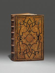 veau fauve, listel rehaussé de cire noire cerné de trois filets dorés en encadrement, important décor de listels noirs droits et courbes entrecroisés agrémenté d'arabesques au filet doré ponctué de gros fers azurés ou peints, cartouche central en réserve frappé postérieurement de l'initiale M couronnée, dos orné d'un fleuron azuré, coupes décorées, tranches dorées, boîte de maroquin rouge (Reliure parisienne de l'époque).