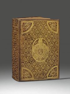 Magnifique édition de ce célèbre office de la vierge connu sous le nom d'Heures du roi Henri III. # Imprimée en rouge et noir « par le septième typographe honoré du titre d'imprimeur du roi, écrit Alès, en caractères romains bien espacés et d'un gros œil », l'édition est ornée d'une remarquable illustration gravée en taille-douce, comprenant une vignette sur le titre et dix-huit jolies figures dans le texte, dont quatorze à pleine page, non signées, hormis le Couronnement de la Vierge (f. 63), par Rabel, et la Crucifixion (f. 158), qui porte le monogramme AB. # Exemplaire réglé. # Précieuse et riche « reliure d'amour » aux grandes armes de Piney-Luxembourg réalisée pour François de Luxembourg et Diane de Lorraine, sa première épouse, dont le chiffre entrelacé et mêlé d'emblèmes de la fidélité est semé sur les plats et le dos du volume. # Cette provenance est d'une insigne rareté. # François de Luxembourg (v. 1546-1613) est un gentilhomme tenu en grande estime à la cour de France. Conseiller d'Henri III, il est comblé d'honneurs par son souverain, qui érige la baronnie de Piney dans l'Aube en duché en 1576, puis en pairie en 1586, et celle de Tingry en principauté, le fait chevalier du Saint-Esprit dès la création de l'ordre, l'envoie comme ambassadeur auprès du pape à Rome en 1586. Il est par ailleurs certain qu'il joua un rôle dans la conversion d'Henri IV au catholicisme et dans la négociation avec le Saint-Siège de son remariage. (C'est à Marie de Médicis, d'ailleurs, qu'il vendit en 1612 son hôtel parisien situé rue de Vaugirard, l'actuel Petit Luxembourg, avant de se retirer dans son château de Pougy). # En 1576, François de Luxembourg avait épousé en premières noces Diane de Lorraine-Aumale, la fille de Claude de Lorraine. En faisant frapper leurs chiffres respectifs entrelacés, un Φ pour François et un double Δ pour Diane, sur cette luxueuse reliure emblématique recouvrant un Office de la Vierge publié en 1586, François de Luxembourg a sans doute voulu commémorer son élévation à la pairie et, par la même occasion, ses dix années de vie conjugale. En témoignent ces fers symboliques répétés dans le décor de la reliure : le S fermé qui signifie fermesse d'amour ou fidélité et les mains unies, ou mains-de-foi, autre attribut de fidélité. Fidélité qu'évoque encore le chiffre des époux, lu phi-delta pour fidelitas ou fedeltà. # Une reliure quasiment identique fut réalisée pour le Pseautier de François de Luxembourg, publié la même année par Jamet Mettayer, de la collection Michel Wittock (vente III à Paris, 7 octobre 2005, lot 43, ill.). # L'originalité du décor emblématique et la qualité de la dorure permettent de croire que ces deux reliures ont été exécutées dans un des meilleurs ateliers parisiens du temps, peu après la sortie de presse des volumes. # De la bibliothèque des ducs Charles II et Robert Ier de Parme (ex-libris, vente à Paris, 30 mai 1932, lot 222, ill.). Conservée au château de Weistropp en Saxe, la bibliothèque du comte de Villafranca – titre de courtoisie de Charles-Louis de Bourbon-Parme (1799-1883), duc de Parme de 1847 à son abdication en 1849 – renfermait quelque 5500 livres précieux, dont les deux tiers étaient des ouvrages de liturgie ou d'histoire religieuse. À la mort de Charles-Louis de Bourbon, sa bibliothèque fut transportée au château de Schwarzau am Steinfeld, en Autriche, où elle échut à son petit-fils, Robert de Bourbon-Parme (1848-1907), dernier duc souverain de Parme déposé en 1859. # Dans le catalogue de la bibliothèque du comte de Villafranca, Anatole Alès prête assez curieusement les armes de cette reliure à Henri III (Bibliothèque liturgique… Charles-Louis de Bourbon, comte de Villafranca, Paris, 1878-1884, n°194). Cette attribution erronée se retrouve dans le catalogue de la bibliothèque des ducs de Parme rédigé par Hanns Bohatta (Katalog der liturgischen Drucke der XV. und XVI. Jahrhunderts in der herzogl. Parma'schen Bibliothek in Schwarzau am Steinfeld, Vienne, 1909, n°354). # De la bibliothèque Étienne Beauvillain (ex-libris, vente anonyme à Paris, 13 octobre 1993, lot 103). # La reliure est conservée dans un étui de maroquin vert signé de Lortic, probablement réalisé pour Charles-Louis de Bourbon, titré au dos : Heures à l'usage de Rome. # Quelques très discrètes restaurations, charnières fendillées, gardes et tranchefiles renouvelées. Exemplaire légèrement bruni, mouillure marginale et menus défauts intérieurs. # Bohatta : Livres d'heures, n°223 – Lacombe, n°485. # Hobson : Fanfare, n°303. # Expositions : Cinq siècles d'ornements, n°47 – Une vie, une collection, n°8.