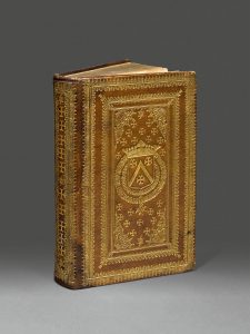 parties en un volume in-4 (240 x 148 mm), maroquin fauve, plats richement ornés de multiples encadrements de filets et roulettes dorés, dont deux ponctués aux angles de chardons et de fleurs de lis, rectangle central orné d'un semé de croix ancrées, d'éventails et de petits fers courbes aux écoinçons, armoiries dorées au centre, dos lisse orné de croix ancrées et d'un chiffre doré dans un encadrement de filets et roulettes dorés, simple filet sur les coupes, tranches dorées, traces d'attaches (Reliure de l'époque).