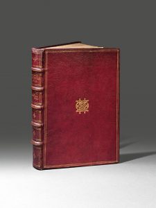 Édition originale de cette importante monographie sur la ville d’Anvers. # L’ouvrage se compose de deux parties, publiées séparément par Jean I Moretus, dont ce sont les dernières publications ; sa succession à la tête de l’ancienne imprimerie de Plantin fut ensuite assurée par sa femme et ses deux fils. # La première partie, Antverpia, est à dédiée à l'histoire et à l'architecture de la cité. Elle est suivie d'un appendice de 24 pp. sous le titre général Η πρωτογενεια και επιστρεφομενη τυχη της Aνβερσης, composé d'une dédicace en prose et de six éloges d'Anvers en vers grecs et hébreux, chacun signé L.S. ou G.S. # Dans la seconde partie, Origines Antverpiensium, l'auteur traite de divers aspects sociaux, culturels et artistiques de la ville d'Anvers, tels le système éducatif, les coutumes alimentaires et vestimentaires, la marche du commerce, etc. # L'illustration, gravée en taille-douce, comprend une carte du diocèse d'Anvers, deux plans de la ville et de la citadelle, ainsi que quatre planches dépliantes représentant la cathédrale, le sénat, la bourse et la maison hanséatique. Ces quatre belles vues, attribuées à Pieter van der Borcht, avaient été gravées par Hogenberg pour la Description des Pays-Bas de Guichardin (Moretus, 1581) ; elles ont été retouchées par Théodore Galle pour le présent ouvrage. # Éminent jésuite flamand, le père Charles Scribani (1561-1629) fut recteur du collège d'Anvers de 1598 à 1612, provincial de Flandres de 1613 à 1619 et enfin recteur à Bruxelles de 1619 à 1625. Outre cette fameuse histoire de la ville d'Anvers, il publia une défense de la Compagnie de Jésus contre les calvinistes, un manuel de politique et de gouvernement intitulé Politicus christianus et édita les œuvres posthumes de son maître Lessius. # Superbe exemplaire relié en maroquin rouge au chiffre de Peiresc, le célèbre astronome, mécène et collectionneur provençal, par Simon Corberan, son relieur attitré à Aix-en-Provence. # Né en Provence, Nicolas-Claude Fabri de Peiresc (1580-1637) étudia à Aix, à Avignon, au collège des jésuites de Tournon, où il se prit de passion pour l'astronomie. Il suivit ensuite des cours de droit à Montpellier et devint conseiller au Parlement de Provence, puis secrétaire de son président, Guillaume du Vair. Un premier voyage, à l'âge de dix-neuf ans, l'avait mené en Suisse et en Italie – à Padoue, notamment, où il fit la connaissance de Galilée. Par la suite, de longs voyages lui firent connaître de nombreux savants, humanistes et scientifiques, avec lesquels il entretint une correspondance toute sa vie durant. # « Sa bibliothèque qui comptait plus de 6000 volumes était accompagnée d'un cabinet de curiosités démontrant l'universalité de ses goûts. Contemporain de Gabriel Naudé, le choix de ses livres répondait à la doctrine de la primauté absolue accordée au texte. Mais Peiresc attachait à l'aspect matériel de ses livres un grand intérêt. Il faisait relier en solide maroquin par son relieur Simon Corberan installé dans son hôtel. Chaque détail de la reliure était précisément imposé et l'on peut constater que les titres frappés aux dos de ses reliures sont toujours exacts et datés. Il exigeait des grandes marges pour annoter ses livres, disait-il, mais c'était aussi une dignité supplémentaire accordée aux textes qu'il respectait. Savant lecteur, connaisseur universel, collectionneur passionné, on peut le considérer comme le bibliophile français le plus accompli. » (A. Jammes). # Établi par Simon Corberan, l'exemplaire porte, doré sur les plats, le monogramme grec du collectionneur, ainsi que son cachet ex-libris encré sur le titre. On notera avec G. Pollard que ces reliures sont parmi les premières où se trouve indiquée, dorée sur le dos, la date de l'édition. # De la collection Nicolas-Claude Fabri de Peiresc (monogramme doré sur les plats et cachet humide au titre), l'exemplaire est passé dans la bibliothèque d'Achille de Harlay, comte de Beaumont (ex-dono imprimé au bénéfice du Collège jésuite de Paris) ; puis de ladite institution, connue jadis sous le nom de Collège de Clermont et aujourd'hui de Lycée Louis-le-Grand (ex-libris manuscrit au titre) aux bibliothèques de Gerard et Johan Meermann (vente III à La Haye, 8 juin 1824, lot 576), d'Edward Huydecoper van Nigtevecht (1827-1883), à Utrecht (ex-libris), du vicomte Amaury de Ghellinck d'Elseghem-Vaernewyck au château d'Elseghem (ex-libris) et enfin du chevalier Xavier de Ghellinck Vaernewyck à Bruxelles. # Excellente condition générale, en dépit d'un insignifiant accroc en tête et de très discrètes restaurations à la reliure. # Sommervogel, VII, 984 – Funck, 393-394 – J.-M. Arnoult, « Les Livres de Peiresc dans les bibliothèques parisiennes », in Revue française d'histoire du livre, n°24, 1975 – G. Pollard, « Changes in the style of bookbinding 1550-1830 », in The Library, 5e série, XI/2, juin 1956, p. 90 – Librairie Paul Jammes, Paris, cat. Choix bibliophiliques, [mai 2004], n°33. # Exposition : Musea Nostra, p. 43 – Une vie, une collection, n°15.