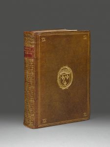 Première édition donnée par Thomas Dempster, avec son commentaire, de cet ouvrage savant sur les mœurs et les coutumes des anciens Romains. Elle est dédiée au roi Jacques Ier d'Angleterre. # L'ouvrage, paru originellement à Bâle en 1583, est le travail le plus célèbre de l'historien et antiquaire allemand Johann Roszfeld. « C'est un traité détaillé sur la ville et le peuple romain, la religion, le calendrier des fêtes, les lois, la justice, l'armée, la famille » (Oberlé). Le cinquième livre, notamment, est consacré aux jeux, aux festins, aux mœurs de table, à l'habillement et aux cérémonies nuptiales et funéraires. # Bel exemplaire aux armes et au chiffre de Charles de Valois, duc d'Angoulême (1573-1650), fils naturel du roi Charles IX et de sa maîtresse Marie Touchet. # Charles de Valois-Angoulême possédait une bibliothèque nombreuse dont les livres étaient pour la plupart revêtus de sobres et solides reliures en maroquin à ses armes et à son chiffre. Ils furent légués par son fils aîné, Louis de Valois, comte d'Alais, au monastère de La Guiche, en Charolais, et furent ensuite dispersés lors de la Révolution. # Le présent exemplaire connut cependant un sort différent : il ne comporte pas l'habituel ex-libris manuscrit du monastère de La Guiche et se trouvait dans une bibliothèque anglaise avant la Révolution. # Le dos de la reliure, à l'origine simplement frappé du double C entrelacé de Charles de Valois, fut par la suite recouvert d'un gracieux décor doré à volutes florales, exécuté dans la seconde moitié du XVIIe siècle pour un bibliophile raffiné qui voulut sans doute harmoniser le volume avec les autres dos de sa bibliothèque. # Des bibliothèques John Hay, marquis de Tweeddale (ex-libris armorié) et Roger Peyrefitte (ex-libris, vente I à Paris, 20 décembre 1976, lot 40). # Coiffes restaurées, petite déchirure sur un coin. Le feuillet Ccc4 a été relié avant le feuillet Ccc3. # Graesse, VI, 166 – Brunet, IV, 1398 (éd. de 1743) – Cicognara, n°3861 (éd. de 1743) – Oberlé : Coll. Fritsch, n°38 (éd. de 1663) – Green : Scottish Latin Authors in print, 2012, p. 106, n°11b – Guigard, I, 34 – OHR, pl. 2600. # Exposition : Une vie, une collection, n°14.