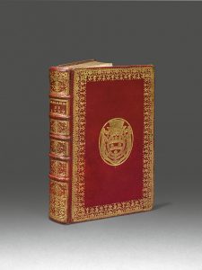 Bel exemplaire dans une jolie reliure à dentelle aux armes du chancelier d'Aguesseau. # Henri-François d'Aguesseau (1668-1751), seigneur de Fresnes, fut chancellier de France et garde des Sceaux durant plus de trente ans, entre 1717 et 1750 (de fait, son cancellariat connut deux interruptions entre 1718 et 1727 et les Sceaux furent confiés à des ministres distincts de 1718 à 1737). Membre honoraire de l'Académie des sciences, il en fut deux fois le président, en 1729 et 1738. # « Profond érudit et jurisconsulte remarquable, le chancelier d'Aguesseau introduisir de notables améliorations dans la législation. Il avait rassemblé une bibliothèque importante et bien choisie ». L'inventaire de sa bibliothèque, aujourd'hui conservé à la BnF, fait état de plus de quatre cents volumes, dont son second fils, Jean-Baptiste-Paulin d'Aguesseau, hérita à la mort du chancelier. # Le type de papier gaufré qui orne les doublures a été inventé en Allemagne à la fin du XVIIe siècle et son décor s’inspire souvent de motifs baroques floraux. La technique est issue de l’impression sur tissus au moyen de plaques de cuivre gravées, telle qu’elle était pratiquée à Augsbourg, d’où le nom de « papiers d’Augsbourg » qu’on rencontre parfois en France sur des almanachs luxueusement reliés. # Le calendrier est interfolié. # Les gardes mobiles du volume, dans le même papier que la doublure, ont été supprimées. # OHR, pl. 594. # Exposition : Une vie, une collection, n°26.