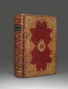 rouge, large dentelle dorée composée de six grands fers à raccords et agrémentée de moindres fers de coquillages, fleurs à pistil, fleurettes et points, monogramme (mar) répété dans les fers d'angles, cartouche rocaille surmontée d'une couronne royale fermée contenant le même monogramme et une croix pattée, dos orné de cartouches ovales au même monogramme entourés de petits fers, monogramme (ma) répété en tête et en queue, coupes ornées, roulette intérieure, tranches dorées sur marbrure, douze onglets de soie rouge (Reliure de l'époque).