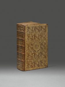 plats richement ornés d'un décor aux petits fers dorés composé de compartiments quadrilobés chargés de fleurs tigées et de palmettes alternés de fers de dauphins couronnés entourés de fleurettes et d'étoiles, armoiries dans l'ovale central, dos orné de petits fers et de dauphins et fleurs de lis alternés, coupes ornées, roulette intérieure, doublure et gardes de papier doré, tranches dorées (Reliure de l'époque).