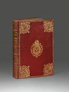 grands fers spéciaux rocaille à la colombe du Saint-Esprit aux écoinçons, armoiries au centre, dos orné d'un semé de fleurs de lis et de flammèches du Saint-Esprit alternées, pièce de titre de maroquin fauve, filets sur les coupes, roulette intérieure, tranches dorées (Tiger).