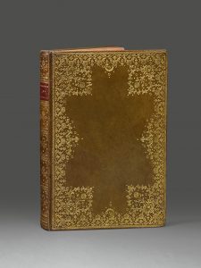 points dorés, large dentelle florale aux fers dorés, grande marguerite aux angles, dos lisse orné, pièce de titre de maroquin rouge, doublure et gardes de moire rose, filets sur les coupes, roulette intérieure, tranches dorées (Reliure de l'époque).