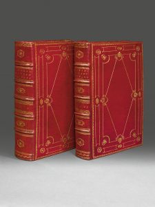 202 mm), maroquin rouge à long grain, fines roulettes dorées, décor de type losange-rectangle sur les plats, orné d'urnes, de gerbes et de rosaces dorées dans les angles et dans les milieux et encadré de compartiments de guirlandes, dos orné de fleurons et grecques dorés, coupes ornées, dentelle intérieure, tranches dorées (Reliure de l'époque).