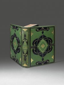 de maroquin bleu nuit, souligné de filets perlés, points dorés et petites plaques dorées à feuillage, dos lisse orné en long du même décor, bordure intérieure ornée de filets perlés et fleurons soulignant de petits médaillons ovales mosaïqués en maroquin bleu nuit, doublures et gardes de reps vert, doubles gardes, couverture et dos, tranches dorées sur témoins, étui assorti, emboîtage moderne de toile verte et bleue (J. Chadel del., René Kieffer rel.).