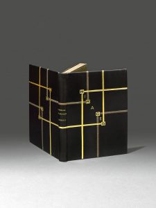 dans la diagonale du rectangle sur le premier plat, bordure intérieure ornée de jeux de filets dorés interrompus par la continuation des listels, doublure et gardes de papier doré, doubles gardes, couverture et dos, tranches dorées sur témoins, emboîtage moderne de toile rouge et bleue (J. Langrand & G. de Léotard).