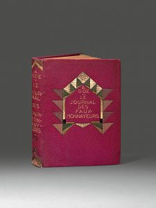 GIDE (André). Le Journal des Faux-monnayeurs. Paris, Éditions Eos, 1926. Petit in-4 (225 x 172 mm), maroquin mauve, composition géométrique de lézard, maroquin beige et brun et pièces peintes en doré mosaïquée sur le premier plat comprenant...