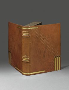 s'entrecroisant en trois petits triangles de maroquin bronze mosaïqué, et de listels dorés verticaux et horizontaux, poussés en creux, dont deux passant sur le dos, dos à deux nerfs titré, encadrement intérieur d'un filet et un listel dorés, couverture et dos, tranches dorées sur témoins, emboîtage moderne de toile grège et brique (Rose Adler, 1924).