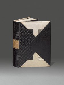 mosaïqués en maroquin noir et crème, certains recouverts d'un treillis de carreaux à froid, dos lisse en maroquin noir recouvert d'un treillis à froid, pièce de titre en maroquin beige, large bordure intérieure en mosaïque de maroquin noir et crème rappelant le décor des plats, doublures et gardes de moire noire brochée de violet, doubles gardes, couverture et dos, non rogné, emboîtage moderne de toile noire et écrue (Pierre Legrain).
