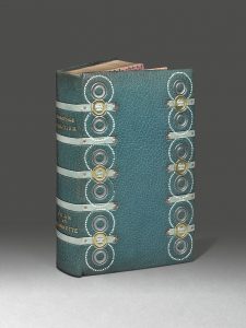 de box vert pâle mosaïqués ornés de petits carrés de maroquin rose mosaïqués, de cercles de points blancs et de motifs circulaires dorés et argentés en creux, dos lisse titré en doré sur lequel passent cinq des listels, bordure intérieure encadrant un fin listel de maroquin rose, doublures et gardes de moire rose, doubles gardes, couverture et dos, tranches dorées sur témoins, chemise et étui, emboîtage moderne de toile bleue (Georges Adenis).