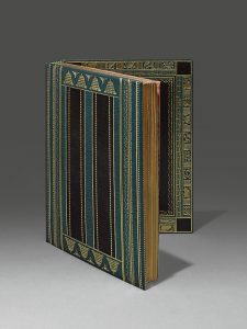 de formes diverses (chaînettes bouclées, ondulées, perlées, guillochées...) et soutenus et surmontés par une rangée horizontale de grosses fleurs stylisées dorées, dos lisse orné de même, titré en long sur le panneau de maroquin noir, filet perlé sur les coupes, doublures de maroquin noir bordées de maroquin vert au riche décor d'animaux, de grecques et de roulettes dorés, gardes de soie jaune or, doubles gardes, couverture et dos, tranches dorées, chemise et étui assortis, emboîtage moderne de toile bleu-gris (Marie-Louise H. Farge).
