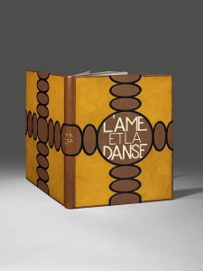 VALÉRY (Paul). L'Âme et la Danse. Dialogue socratique illustré par Raphaël Drouart. Paris, Le Livre contemporain, 1925. In-4 (326 x 245 mm), maroquin havane à encadrement, plats en maroquin miel décorés d'une composition d'ovales de maroquin...