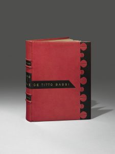 RÉGNIER (Henri de). L'Illusion héroïque de Tito Bassi. Paris, La Roseraie, [1926]. In-4 (278 x 218 mm), chagrin rouge, bandes de chagrin noir mosaïquées ajourées à leurs extrémités de cercles divisés par un filet noir, bandes horizontales...
