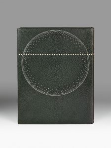 abstrait composé, sur les plats supérieurs, des mêmes éléments avec de légères variations : listels droits, courbes et circulaires mosaïqués en maroquin fauve, beige et noir, jeux de filets dorés et au palladium, grand cercle pointillé au palladium, ligne horizontale de pastilles blanches mosaïquées passant sur le dos et les bordures intérieures, et sur les plats inférieurs d'un grand cercle de points argentés, dos lisse titré au palladium, doublures et gardes de soie à damier noir et gris, doubles gardes, couvertures et dos, tranches argentées sur témoins, chemise et étuis assortis, emboîtages modernes de toile bleue (Paul Bonet).