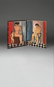 lisse orné du titre à la verticale composé en lettres mosaïquées de veau olive, doublures et gardes décorées de quatre grandes aquarelles gouachées signées et datées Barta, 1933, tête dorée, non rogné, couverture et dos, emboîtage (Laszlo Barta, 1933).