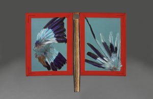 doré, bordure intérieure ornée de filets à froid aux angles, doublures de papier vert ornées chacune d'un panache de plumes multicolores au naturel, gardes de soie brochée vert-de-gris, doubles gardes, couverture et dos, tête dorée, non rogné, emboîtage moderne de toile bleue (Thalheimer).